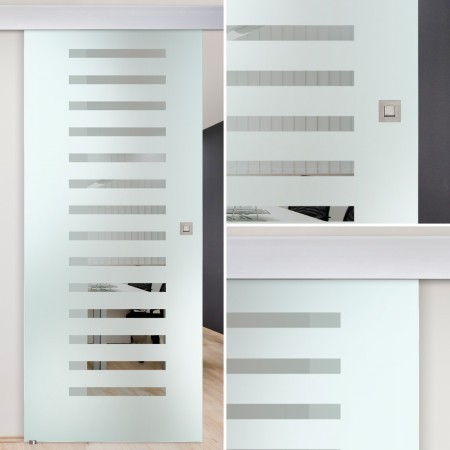 Die Glasschiebetür Balken besteht aus einer großflächigen Mattierung. Diese wird gebrochen durch 14 horizontal und untereinander angeordnete Balken.