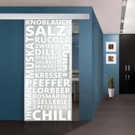 Die Schiebetür aus Glas mit dem passenden Namen "Spice" finden Sie auf linarto.de in verschiedenen Variationen. Als Ganzglastür, Lichtausschnitt, V1000 Schiebetür oder eben wie hier zu sehen an einem ALU60 Schiebesystem. Bei dieser Variante ist das gesamte Türblatt blickdicht und undurchsichtig. Als Dekor befindet sich auf dem Türblatt ein Schriftzug mit diversen Kräuter- und Gewürznamen. Bei unseren Schiebetüren haben Sie die Wahl zwischen Griffmuschel und Griffstange.