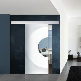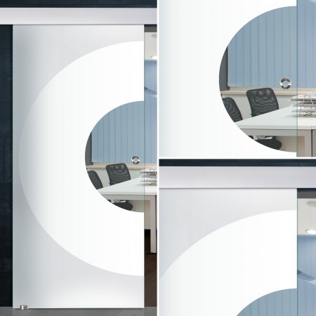 Die Schiebetür "Sphere" besteht aus drei verschieden transparenten Halbkreisen. Der kleine, innere Kreis ist klar und durchsichtig. Der mittlere Halbkreis ist undurchsichtig mattiert. Die äußere Fläche ist transparenter mattiert.