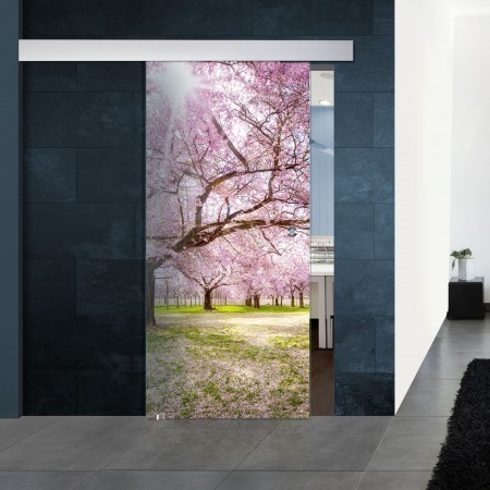 Das Motiv "Frühlingsgefühle" zeigt eine Straße von Kirschbäumen im Frühling. Gedruckt wird direkt auf das Glas (keine Folie)! Klarglas ist ein durchsichtiges Glas, welches mit verschiedenen Techniken veredelt werden kann.