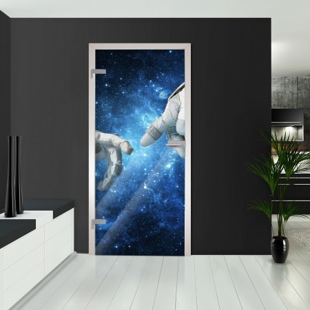 Anders wie bei anderen Anbietern, verwenden wir keine Folie, die zwischen zwei Glasscheiben montiert wird, sondern drucken direkt auf das Glas! Hierbei kommt ein ultraschneller UV-Flachbettdrucker zum Einsatz. Das Motiv "Astronauten" zeigt zwei Astronauten-Handschuhe vor Weltraumhintergrund. Das Motiv ist angelehnt an die berühmten Hände von Da Vinci. Die bedruckte Glastür ist z.B. für Kinderzimmer interessant.