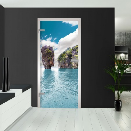 Anders wie bei anderen Anbietern, verwenden wir keine Folie, die zwischen zwei Glasscheiben montiert wird, sondern drucken direkt auf das Glas! Hierbei kommt ein ultraschneller UV-Flachbettdrucker zum Einsatz. Das Motiv "Dream" zeigt eine malerische Landschaft mit Ozean und Bergen.