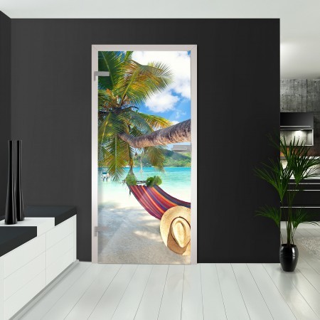 Anders wie bei anderen Anbietern, verwenden wir keine Folie, die zwischen zwei Glasscheiben montiert wird, sondern drucken direkt auf das Glas! Hierbei kommt ein ultraschneller UV-Flachbettdrucker zum Einsatz. Das Motiv "Holiday" zeigt eine Palme an der eine Hängematte befestigt ist. Wenn Sie diese Tür ansehen, können Sie die Seele baumeln lassen.