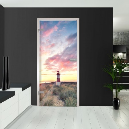 Anders wie bei anderen Anbietern, verwenden wir keine Folie, die zwischen zwei Glasscheiben montiert wird, sondern drucken direkt auf das Glas! Hierbei kommt ein ultraschneller UV-Flachbettdrucker zum Einsatz. Das Motiv "Leuchtturm" zeigt einen kleinen Leuchtturm bei Sonnenaufgang.
