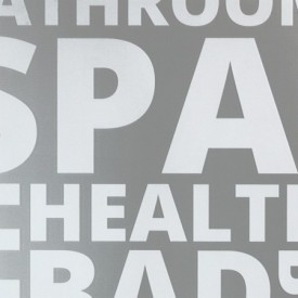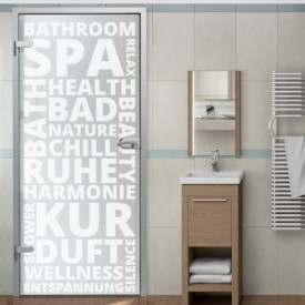 Das Schriftmotiv "Bad/Spa" füllt nahezu die gesamte Fläche der Tür aus. Einzelne Worte in verschiedenen Sprachen die das Thema Wellness aufgreifen.