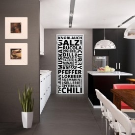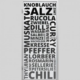 Der Schriftzug enthält unter anderem folgende Wörter: Zwiebel, Knoblauch, Muskat, Pfeffer, Lorbeer, ...