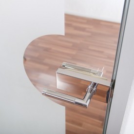 Die Löcher für die Halterung sind in diesem Fall vertikal an der Glastür vorgefertigt. Die Löcher für den Schließmechanismus sind, wie auch bei den 2-teiligen Bändern horizontal gefertigt.
