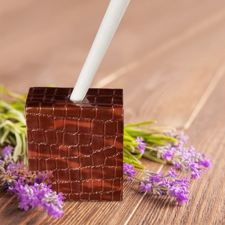 Der Reed Diffuser "Cube" besteht aus einer eckigen Vase, umhüllt mit einem braunem Lederstoff in Retro-Optik.