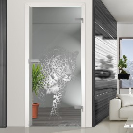 Das Motiv Linarto "Jaguar" zeigt eine Raubkatze (Jaguar) auf Klarglas. Bitte beachten Sie, dass das Motiv auf die Gegenseite gelasert wird.