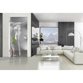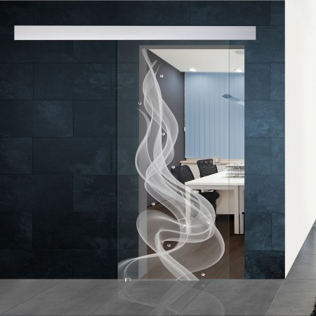 Das Motiv "Smoke" zeigt eine Rauchwolke, die sich über die Klarglas Schiebetür schlängelt. Bitte beachten Sie, dass das Motiv auf die Ansichtsseite gelasert wird, da sich hier Schmucksteine befinden.