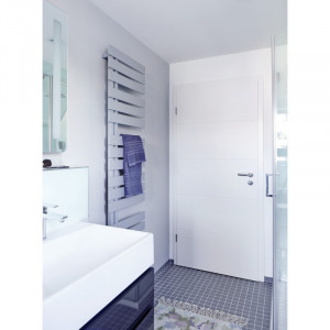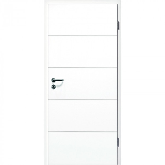 Vier flach geprägte Rillen zieren das weiß lackierte Türblatt. Mit Hilfe einer schlichten und eckigen Kantenführung wird schlichte und charmante Design dieses Models besonderst gut zur geltung gebracht.