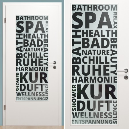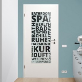 Das Dekor "Spa" ist speziell für Badezimmer und Wellness-Bereiche (Sauna etc.) konzipiert. Das Schrift-Dekor, bestehend aus Wörtern wie Bad, Wellness, Beauty oder Relax, lässt keinen Zweifel daran, welches Raumthema den Besucher hinter der Tür erwartet.