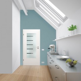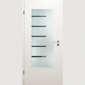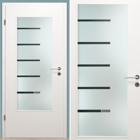 Die Verglasung "Touch" für Innentüren besteht aus einer großflächigen Mattierung sowie fünf klaren und links angeordneten Streifen.