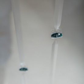 Das Türblatt aus Klarglas ist durchzogen von zwei parallel verlaufenden Kristallrillenschliffen. Diese wiederum werden unterbrochen von insgesamt sieben Schmucksteinen.