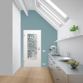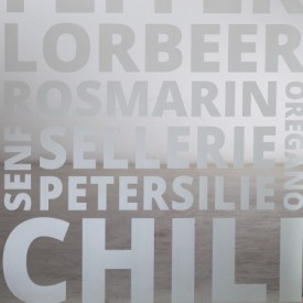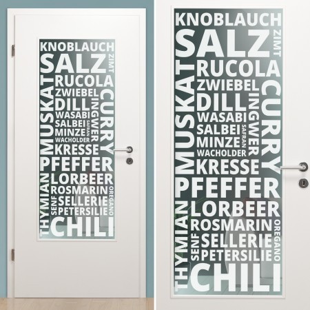 Auch auf einer Innentürverglasung kommt unser Konzeptdekor "Spice" gut zur Geltung! Das Dekor besitzt verschiedene Schriftzüge von Gewürzen und Kräutern.