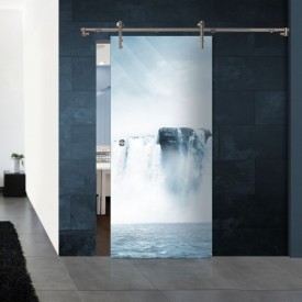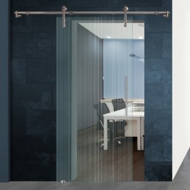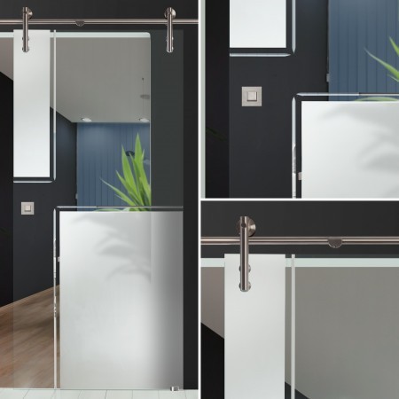 Die zwei Rollwagen mit flächenbündiger Glasbefestigung (Tragkraft: 100kg) sorgen dafür, dass die 8mm starke Scheibe aus Sicherheitsglas (ESG) sicher getragen wird. Die Bodenführung sorgt für eine stabile und sichere Führung der Glastür.