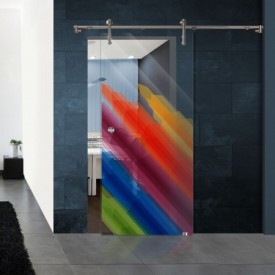 Die Glastür "Squadrato" montiert auf einem V1000 Schiebesystem. Zwei Hingucker auf einmal! Zum einen das moderne Schiebesystem, zum anderen die Glasschiebetür mit ihren großen Dekorflächen und die darum umlaufenden Kristallrillenschliff.