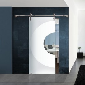 Die Schiebetür "Sphere" ist mit zweierlei Mattierungen ausgestattet. Der mittlere Kreise ist dabei voll mattiert, während die äußere Fläche transparent matt erscheint. Der kleine innere Kreis ist klar und durchsichtig.